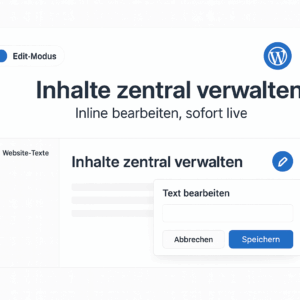 So funktioniert’s – Du definierst Textfelder (Titel + Label, Typ „Text“ oder „Editor“) und ordnest sie Gruppen zu. Diese Felder werden in einer klaren Admin-Oberfläche gepflegt. Im Frontend lassen sich die Werte an beliebigen Stellen als Platzhalter ausgeben. Schalten Administratoren/Autoren den Edit-Modus ein, erscheinen Stiftsymbole neben den Ausgaben. Ein Klick öffnet den Inline-Editor (Text/HTML), Speichern erfolgt per AJAX – mit Rechteprüfung und Nonce-Validierung.